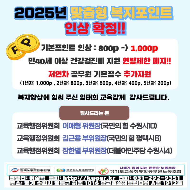 - 인상된 복지포인트: 2025년에는 전년 대비 복지포인트가 인상되어 공무원 여러분께 더욱 풍성한 혜택을 제공합니다. 기존 800P(80만원)이던 복지포인트가 1,000P(100만원)으로 인상되었습니다.